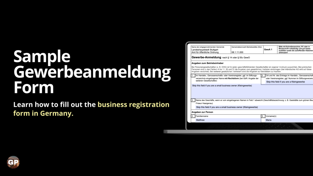 To start a business in Germany, you must register with the local trade office. To do so, you must fill out the Gewerbeanmeldung form. We have filled out the form for a sample user.